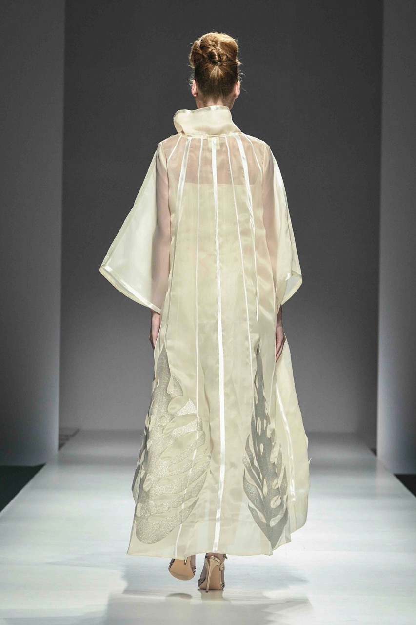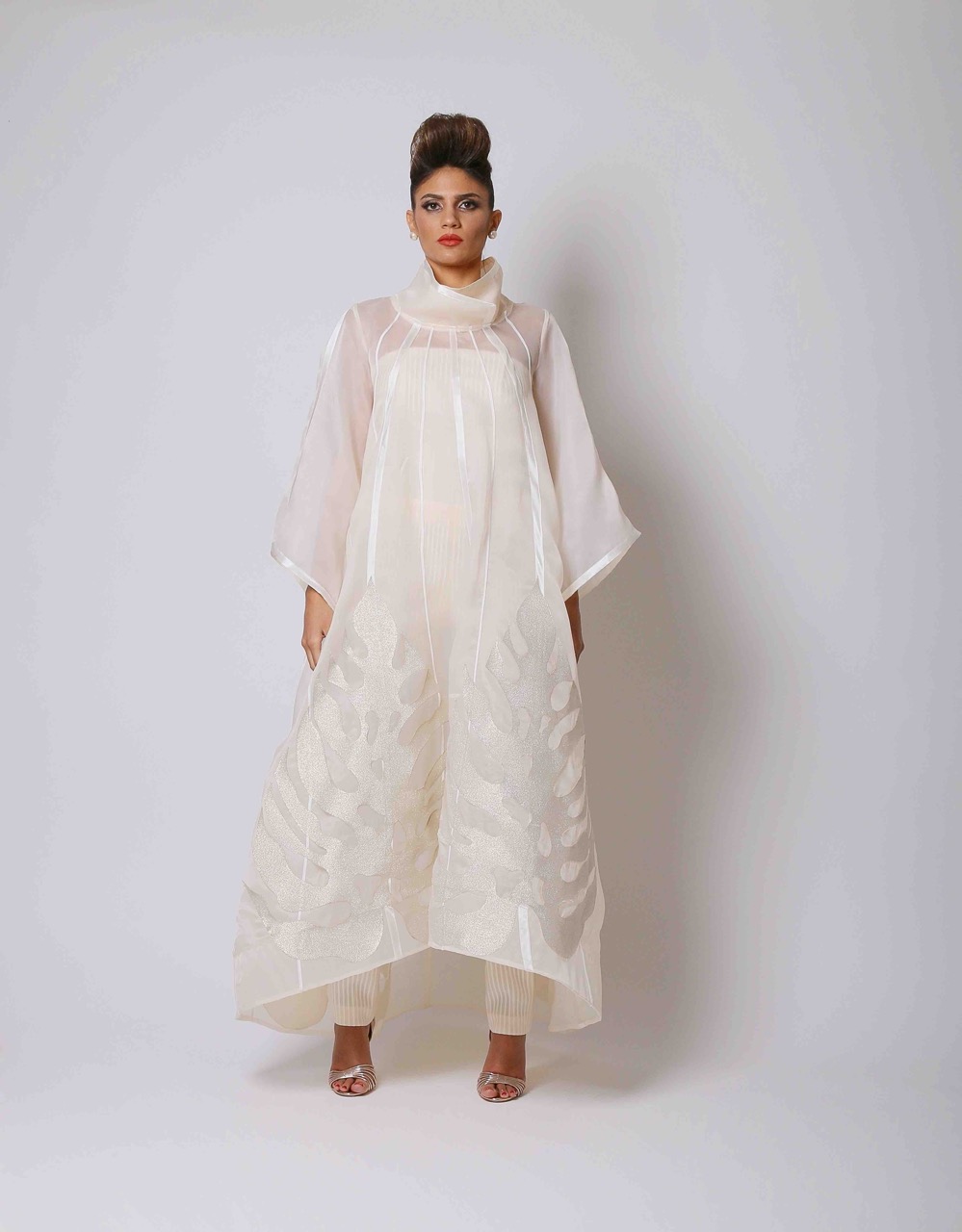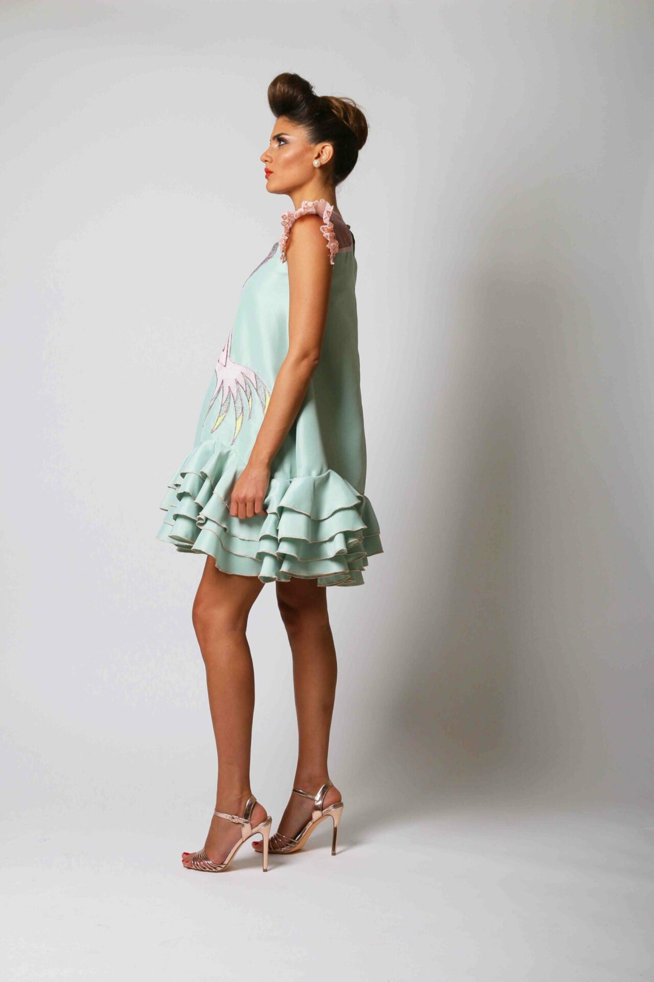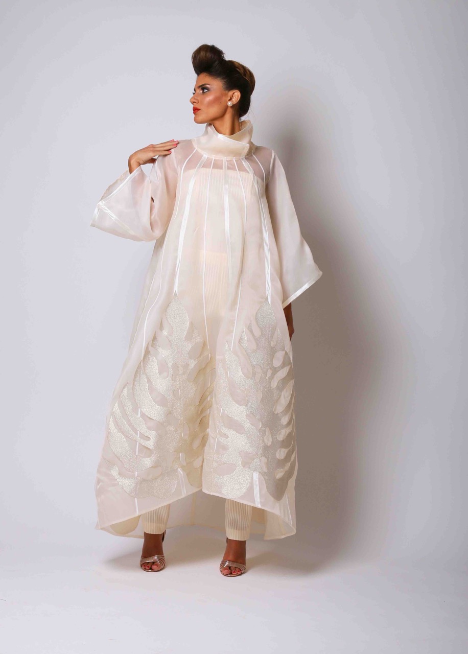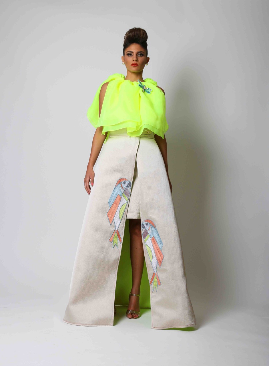 For this collection “Shades of the lagoon”  the designer got inspired by the fabulous wonders of nature of tropical life. The designs are featured by their special colors and fabrics combinations. The art figures shown in the collection including birds, flowers , leaves , iguanas and others were hand drown by the designer and different techniques were used to transform into warble art including silk and beads embroidery , laser cuts , and a new method of drawing with fabrics.