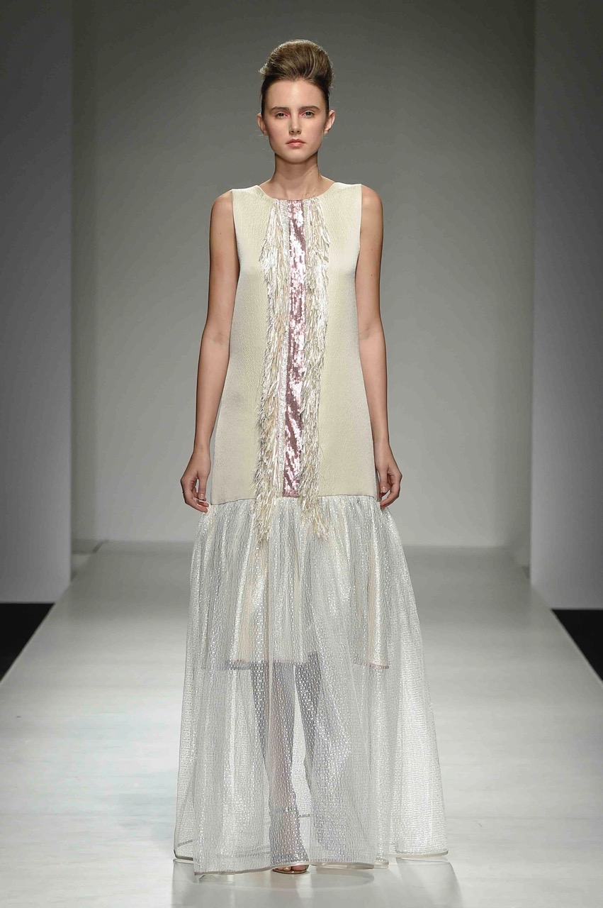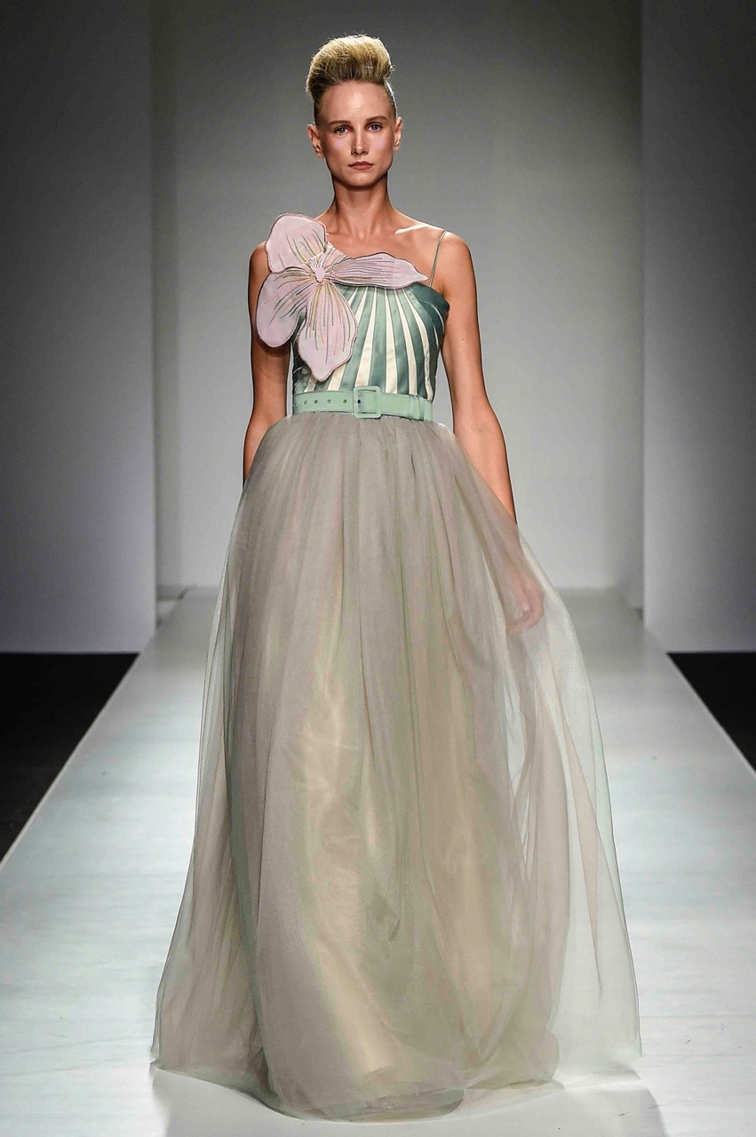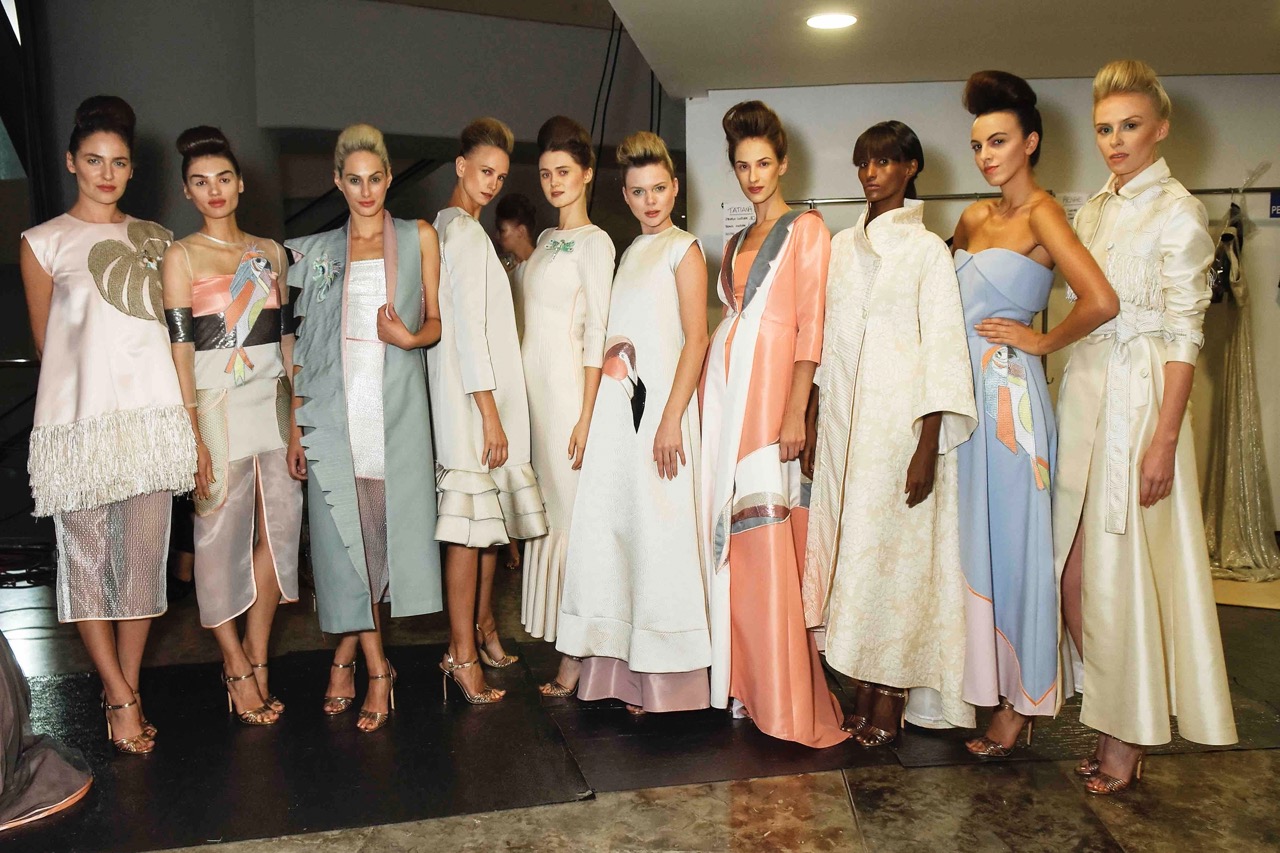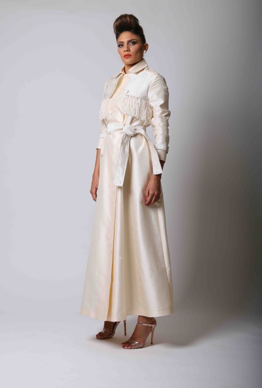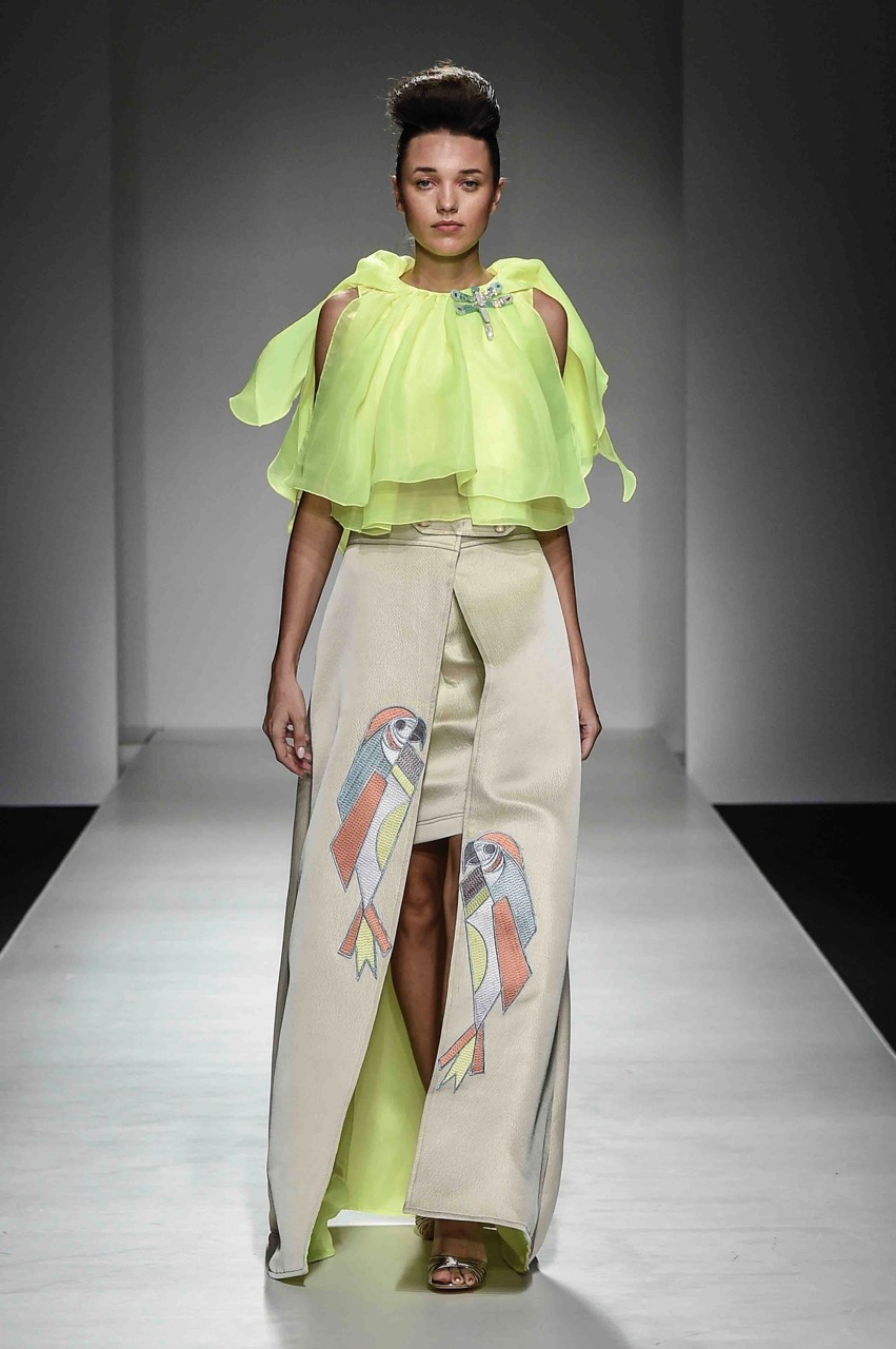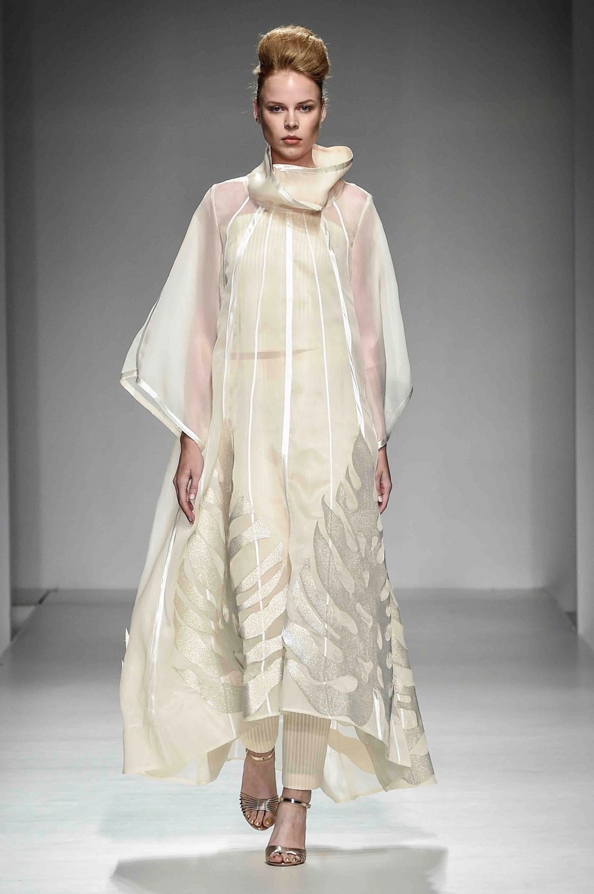 For this collection “Shades of the lagoon”  the designer got inspired by the fabulous wonders of nature of tropical life. The designs are featured by their special colors and fabrics combinations. The art figures shown in the collection including birds, flowers , leaves , iguanas and others were hand drown by the designer and different techniques were used to transform into warble art including silk and beads embroidery , laser cuts , and a new method of drawing with fabrics.