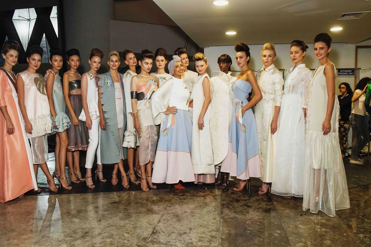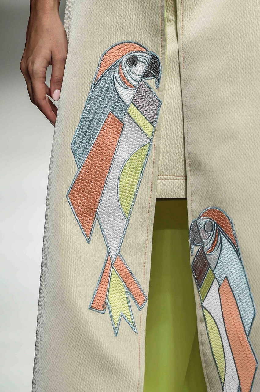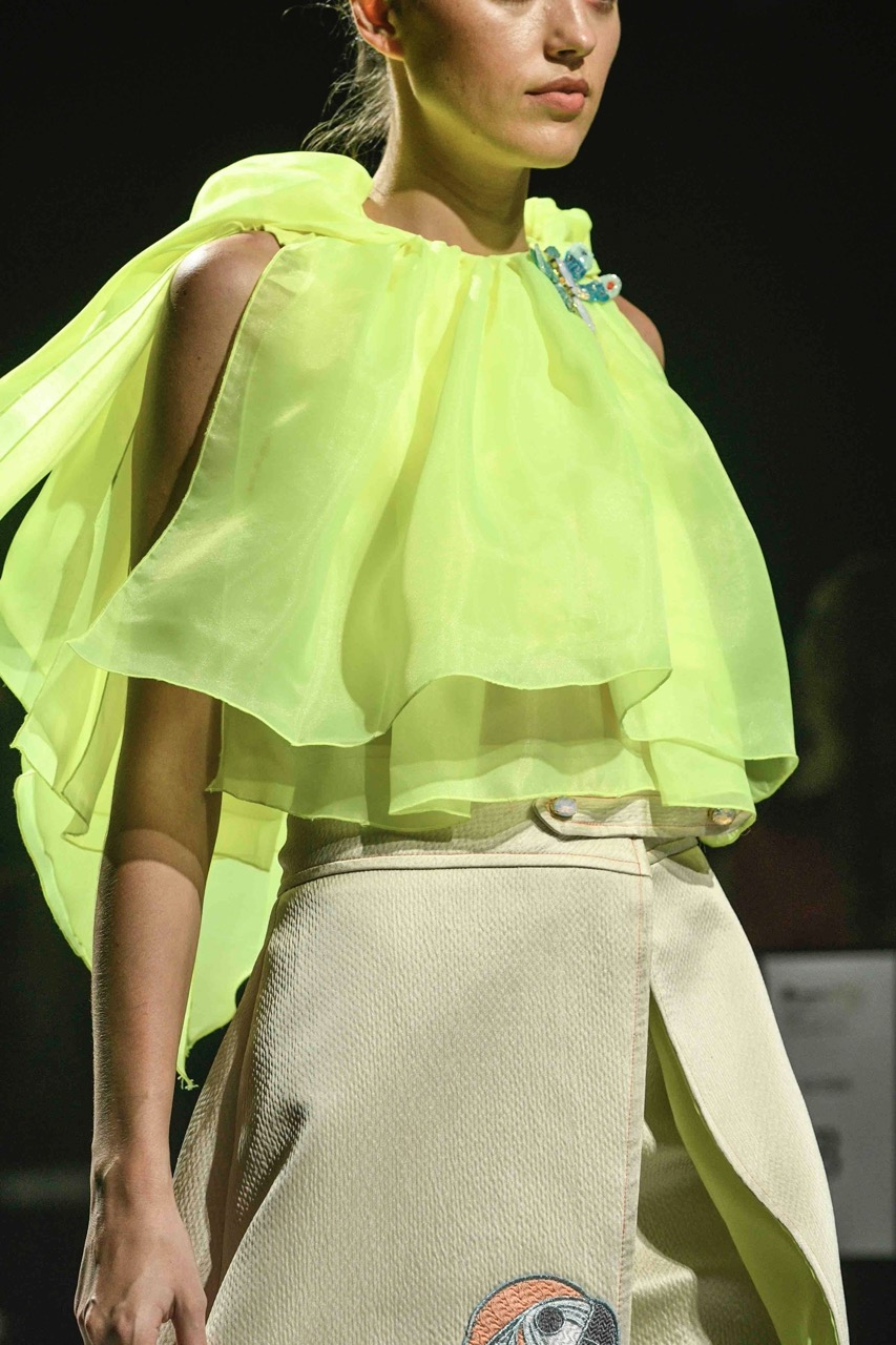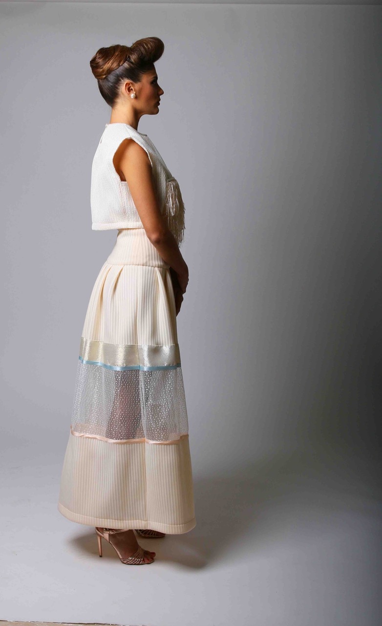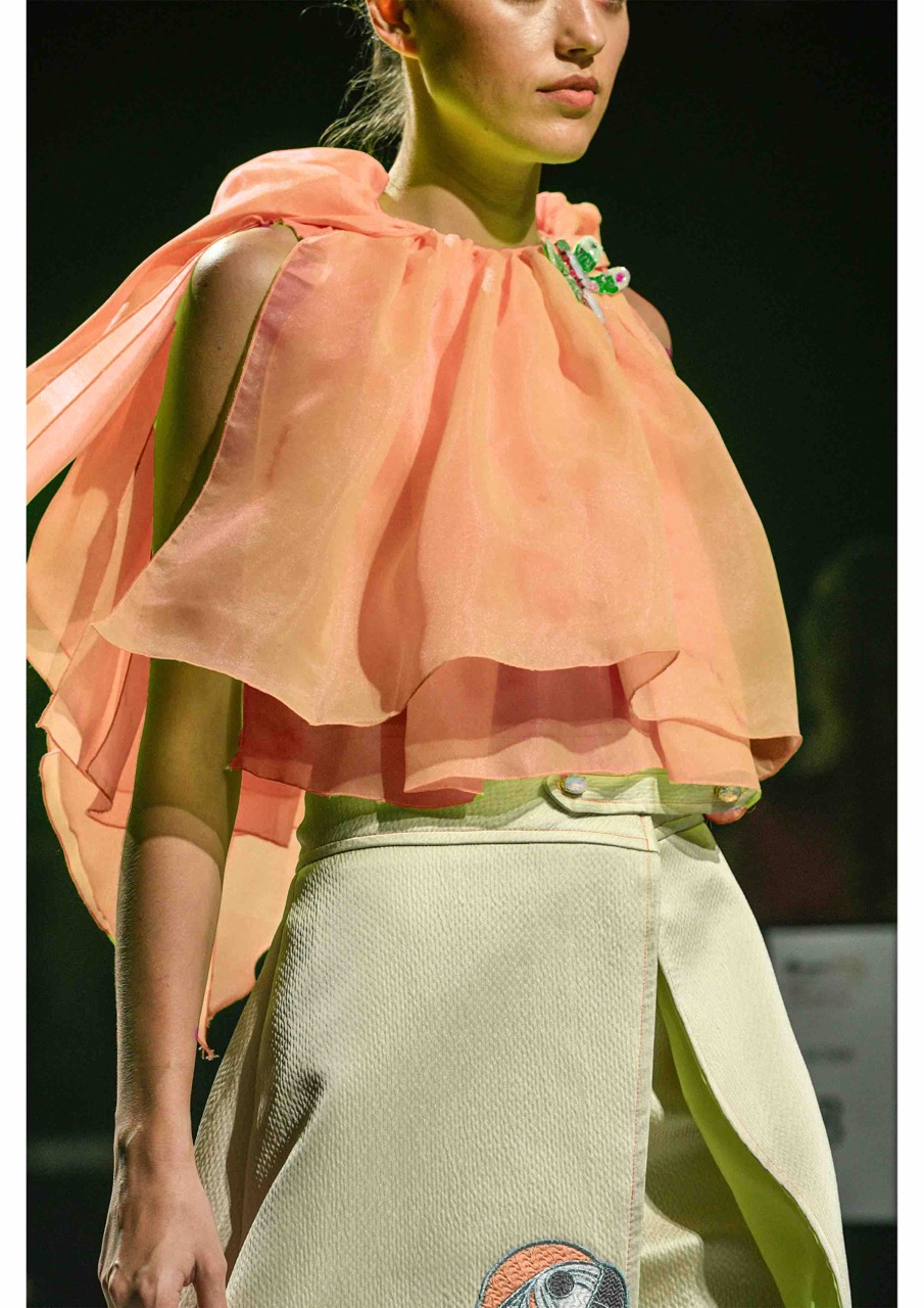 For this collection “Shades of the lagoon”  the designer got inspired by the fabulous wonders of nature of tropical life. The designs are featured by their special colors and fabrics combinations. The art figures shown in the collection including birds, flowers , leaves , iguanas and others were hand drown by the designer and different techniques were used to transform into warble art including silk and beads embroidery , laser cuts , and a new method of drawing with fabrics.